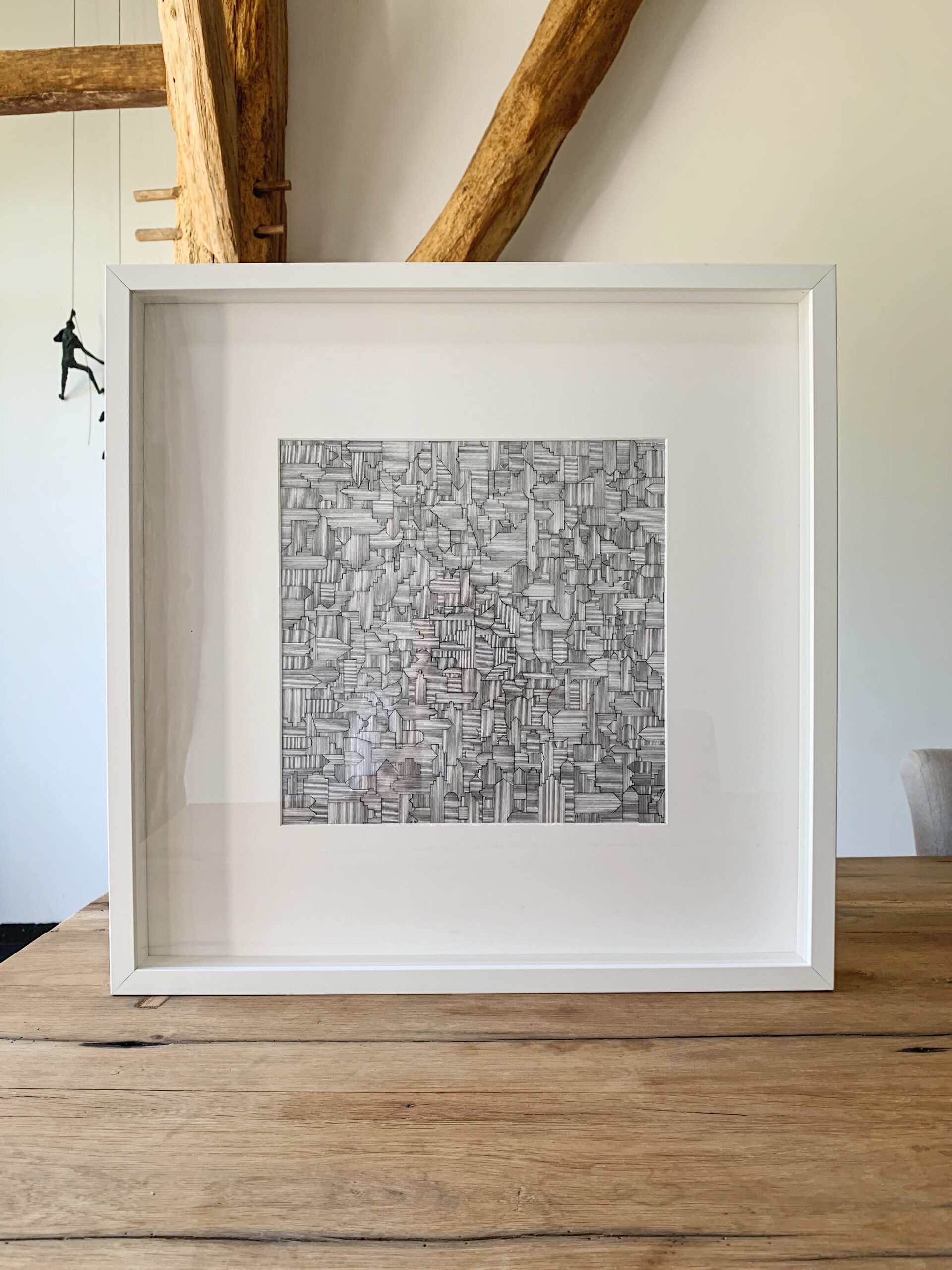 Van een veelvoud aan met liniaal getrokken lijnen probeer ik vormen te minimaliseren en patronen te zoeken en combineren. Vanuit geometrische composities zoek ik soms naar iets herkenbaars, maar net zo vaak laat ik het beeld abstract. Dan draait het vooral om de vormen die samen het geheel maken.